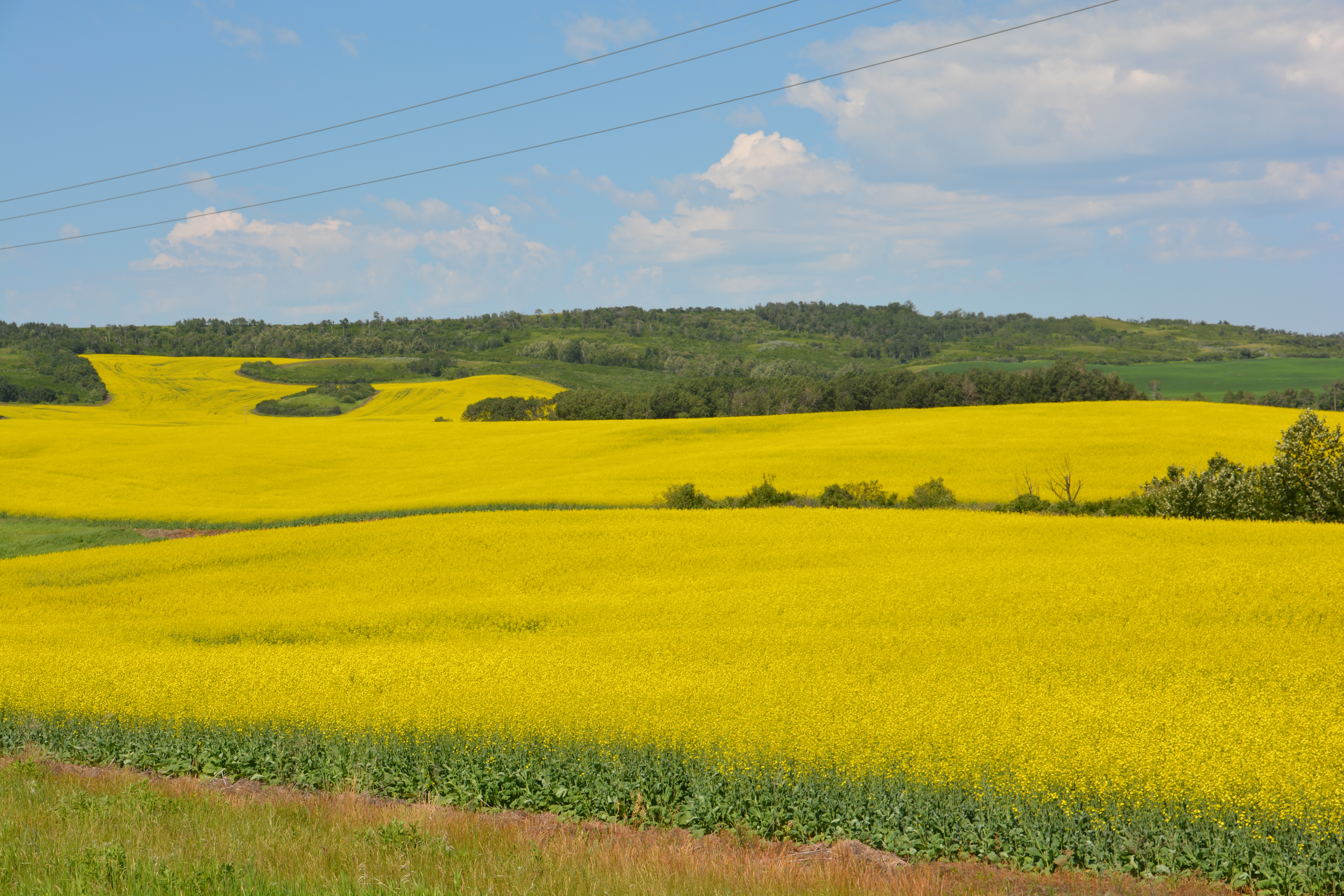 We crossed over into eastern Alberta from Saskatchewan and enjoyed a beautiful tour of the rich and fertile lands that provided the original wealth of this province. The lightly rolling plains were a checkerboard of green and yellow as the bright canola fields mixed in with the traditional green grains and grasses that were enjoying the early summer sun. Small towns on the train line mainly featured huge grain silos and there seemed to be more tractors than cars. In fact, the only vehicle I passed all day on these quiet country roads was a big green tractor – all the local farmers drive their huge trucks like demons possessed!