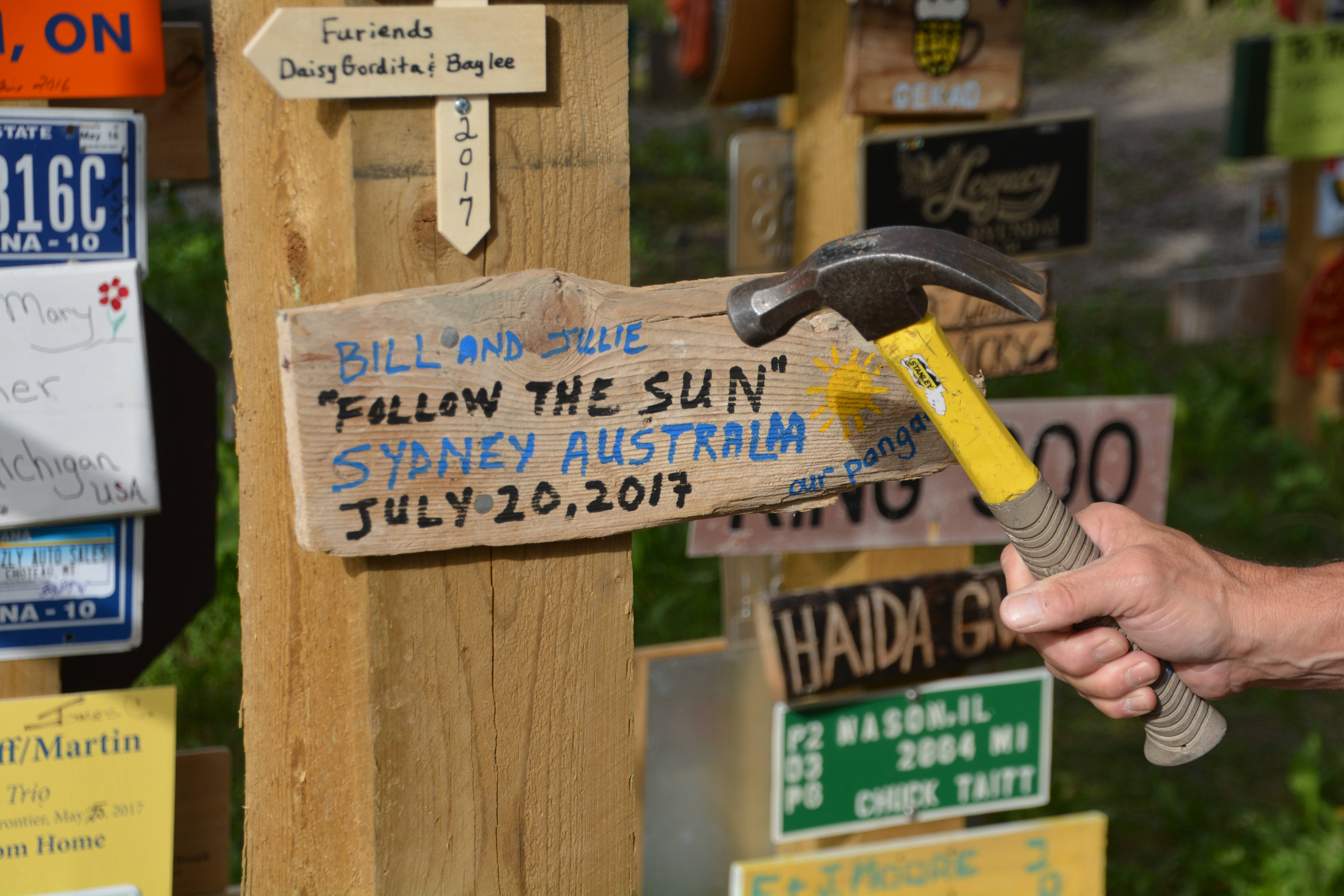 Julie and I walked through the forest and amongst the signs, absolutely gobsmacked by what we saw. And at the end of the day I pulled out an old plank of wood I had picked up in New Mexico about four months earlier and had used to help prop up the jack when changing a tire, we borrowed a marker and some nails and hammered our own sign up on a post – a fun and sentimental moment for us.