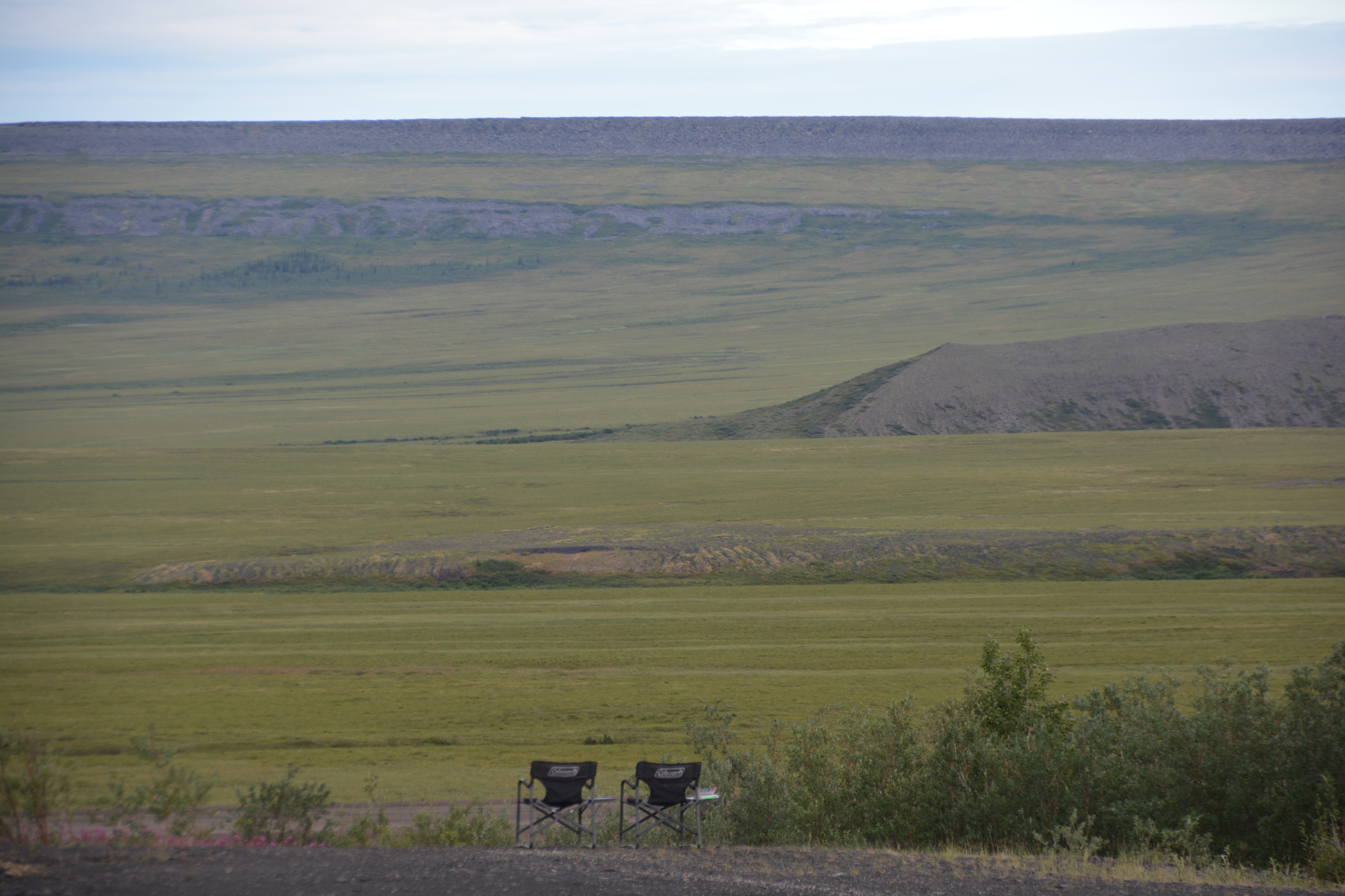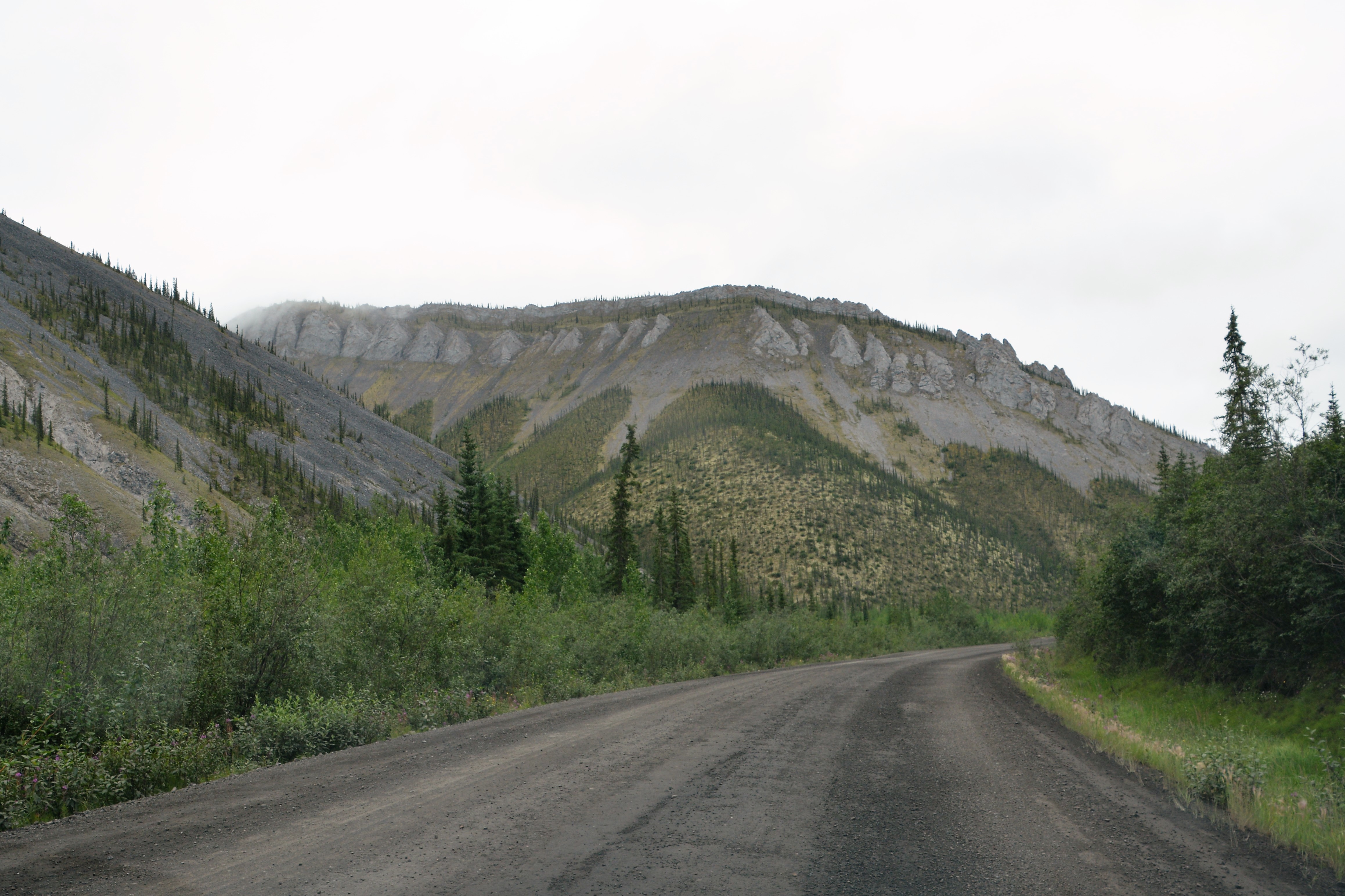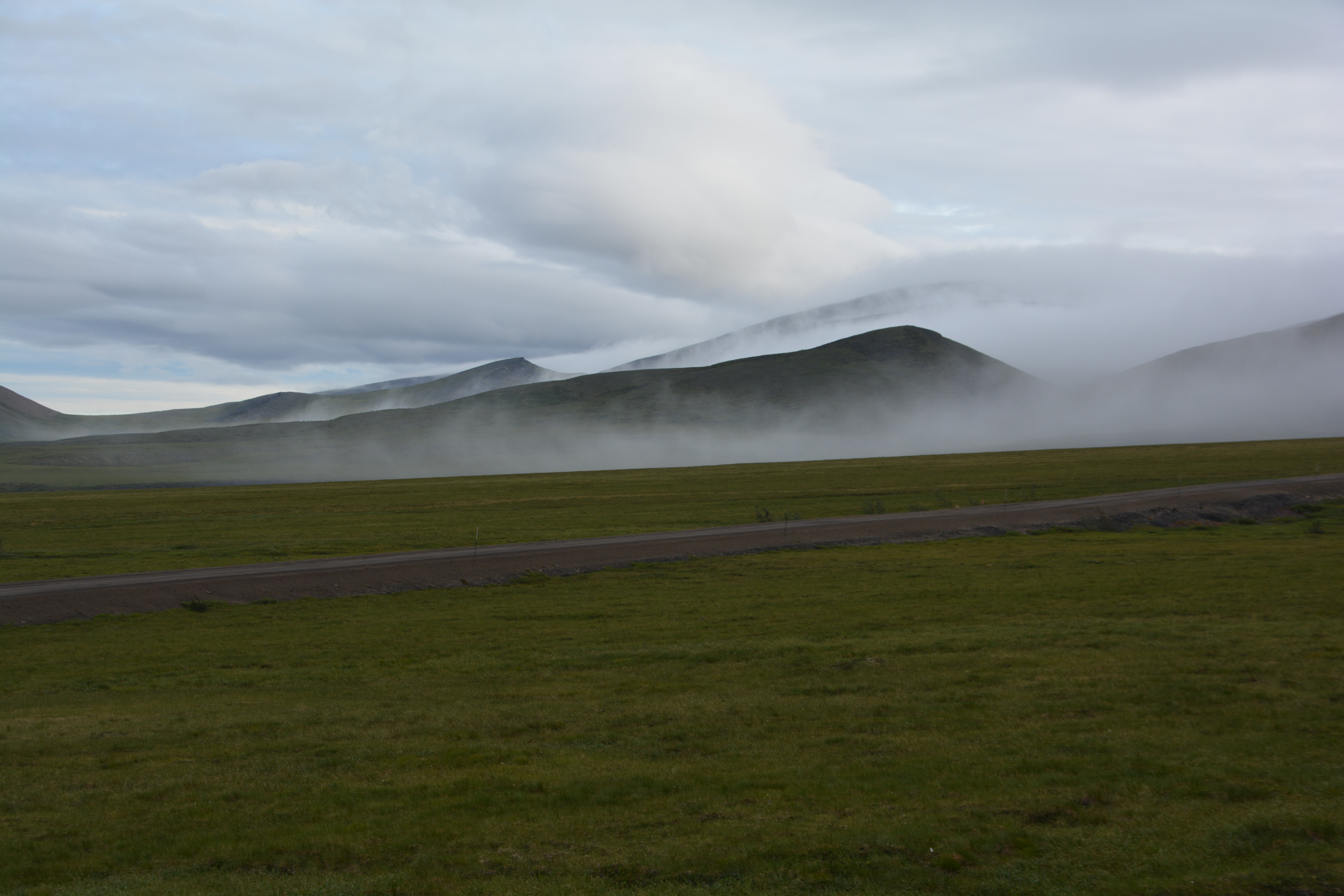 The drive south on the Dempster Highway was similar to the drive north – drizzly, low clouds and fog, slippery road, glimpses of astounding beauty and a forever feeling that we were travelling through a very special place. Late in the afternoon we stopped again at Tombstone Territorial Park, did a short walk to the fog line for expansive views of this stunning setting, saw five beavers in a single pond busy building dams and their lodges, and finally camped in another scenic off-road area near the North Klondike River.