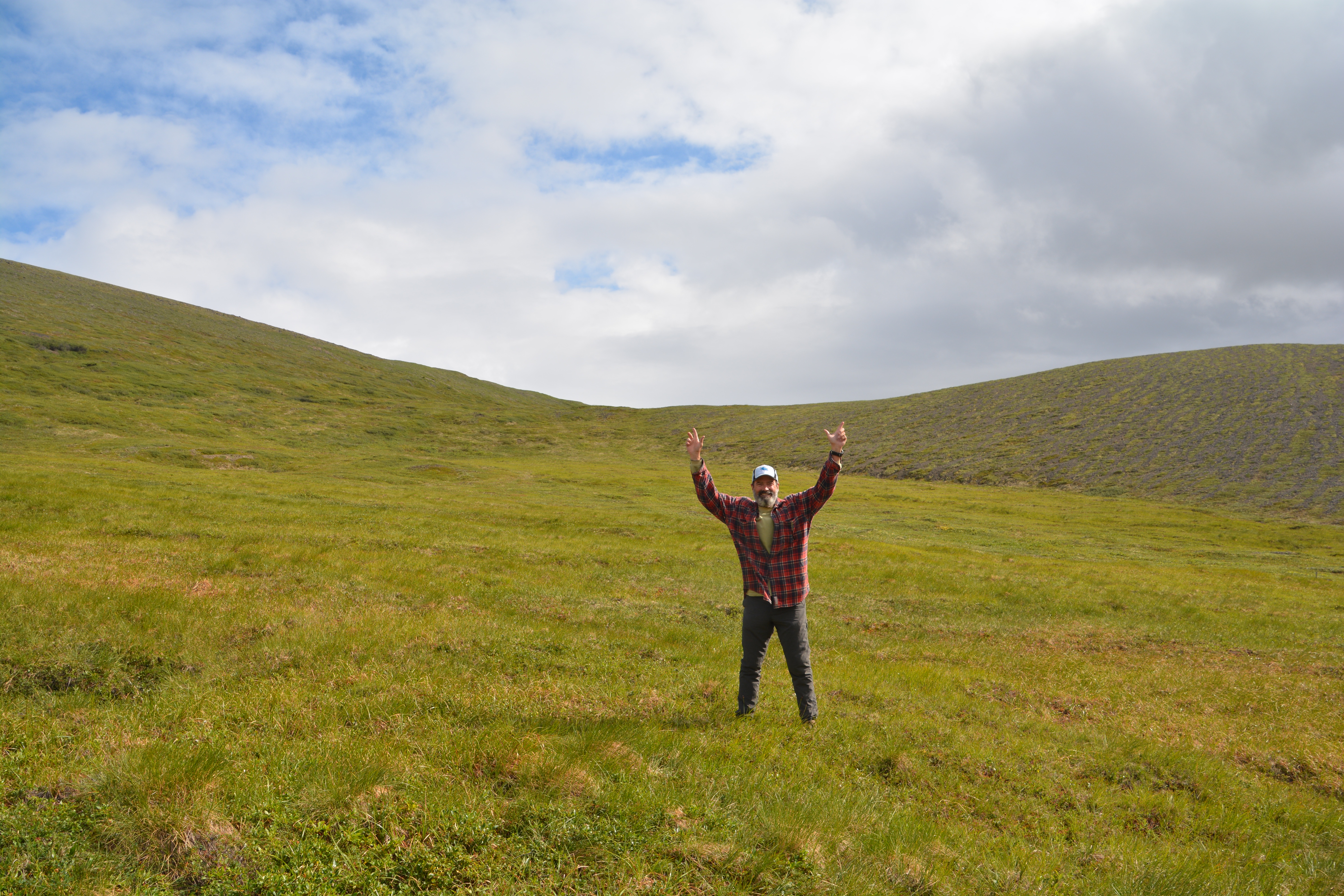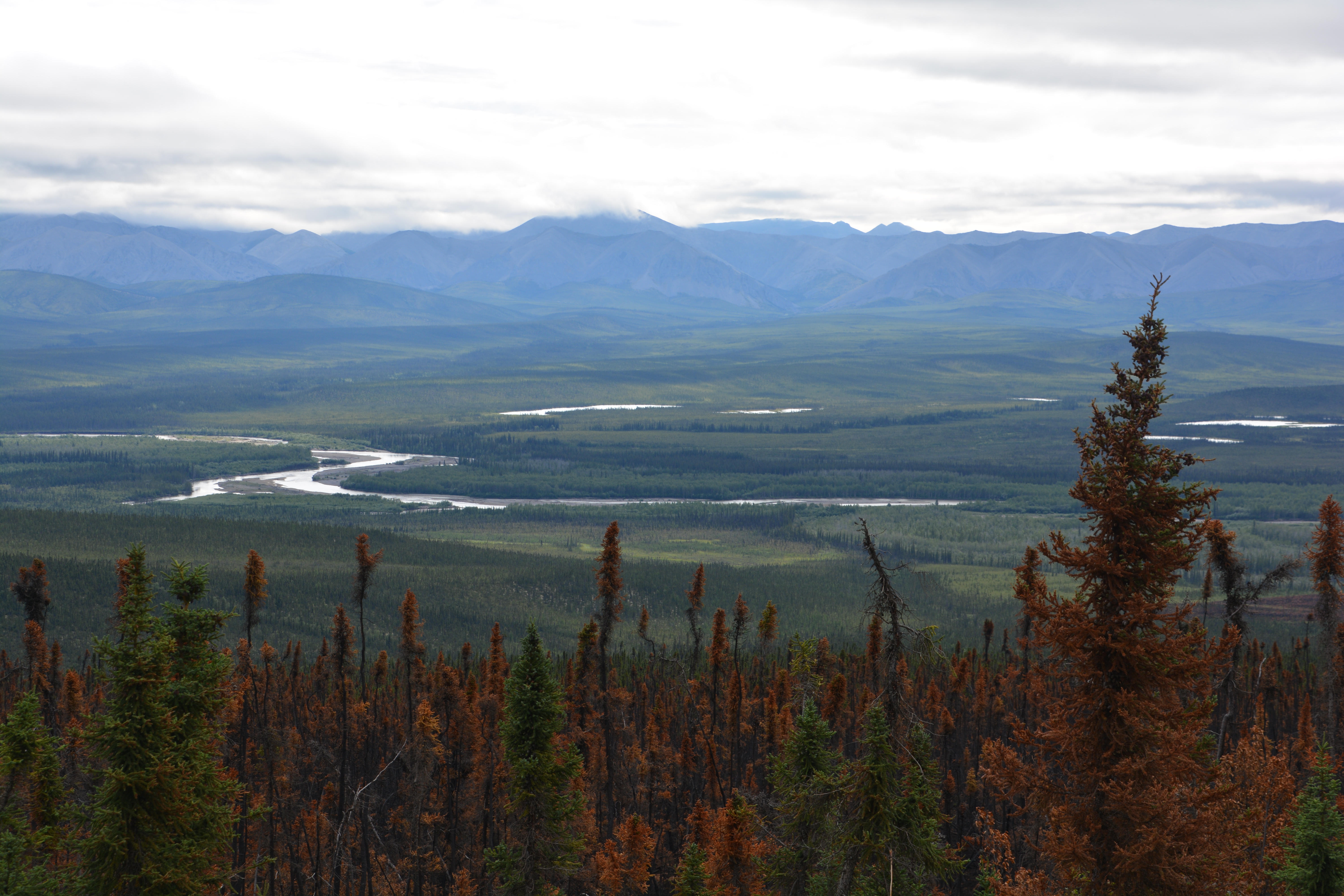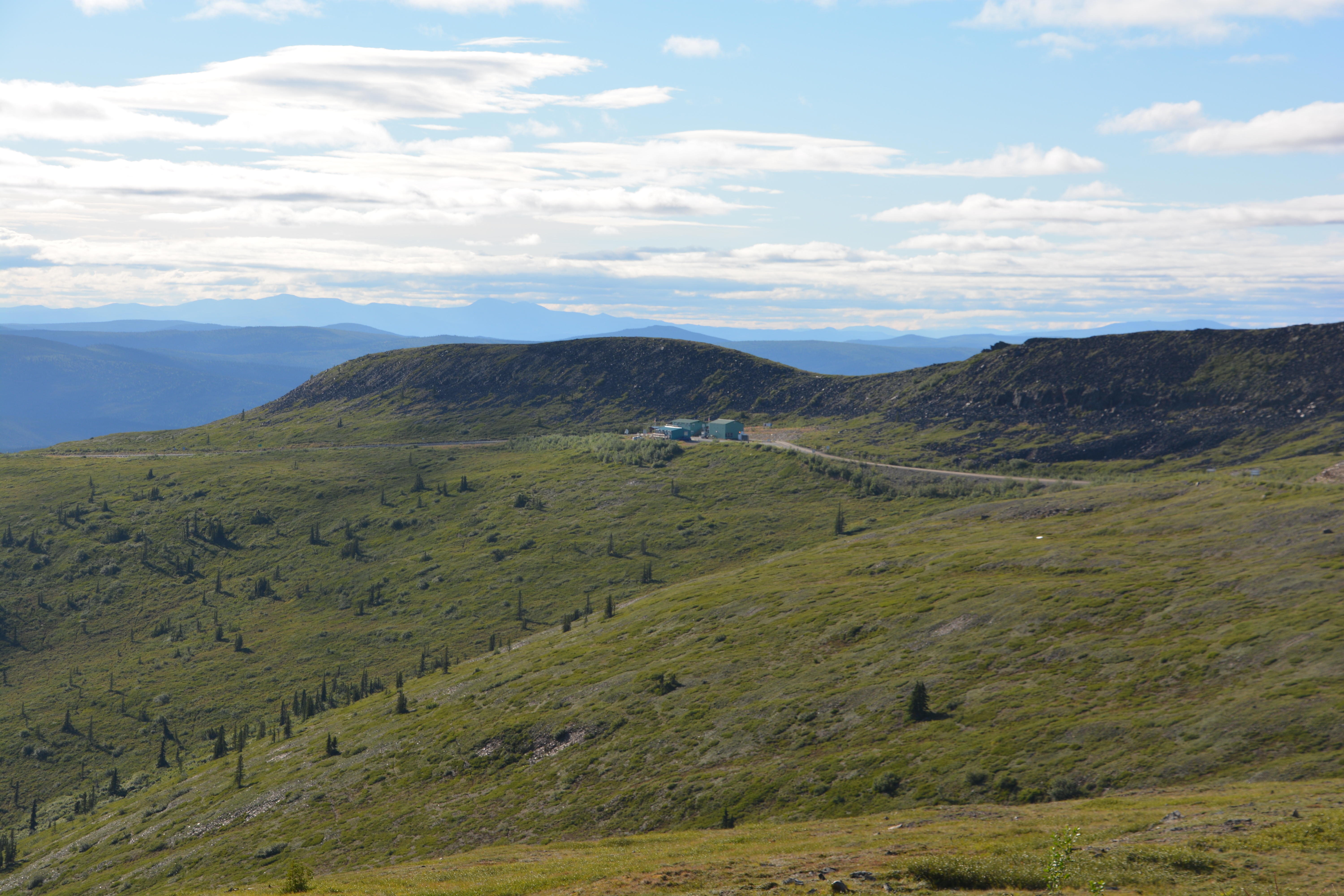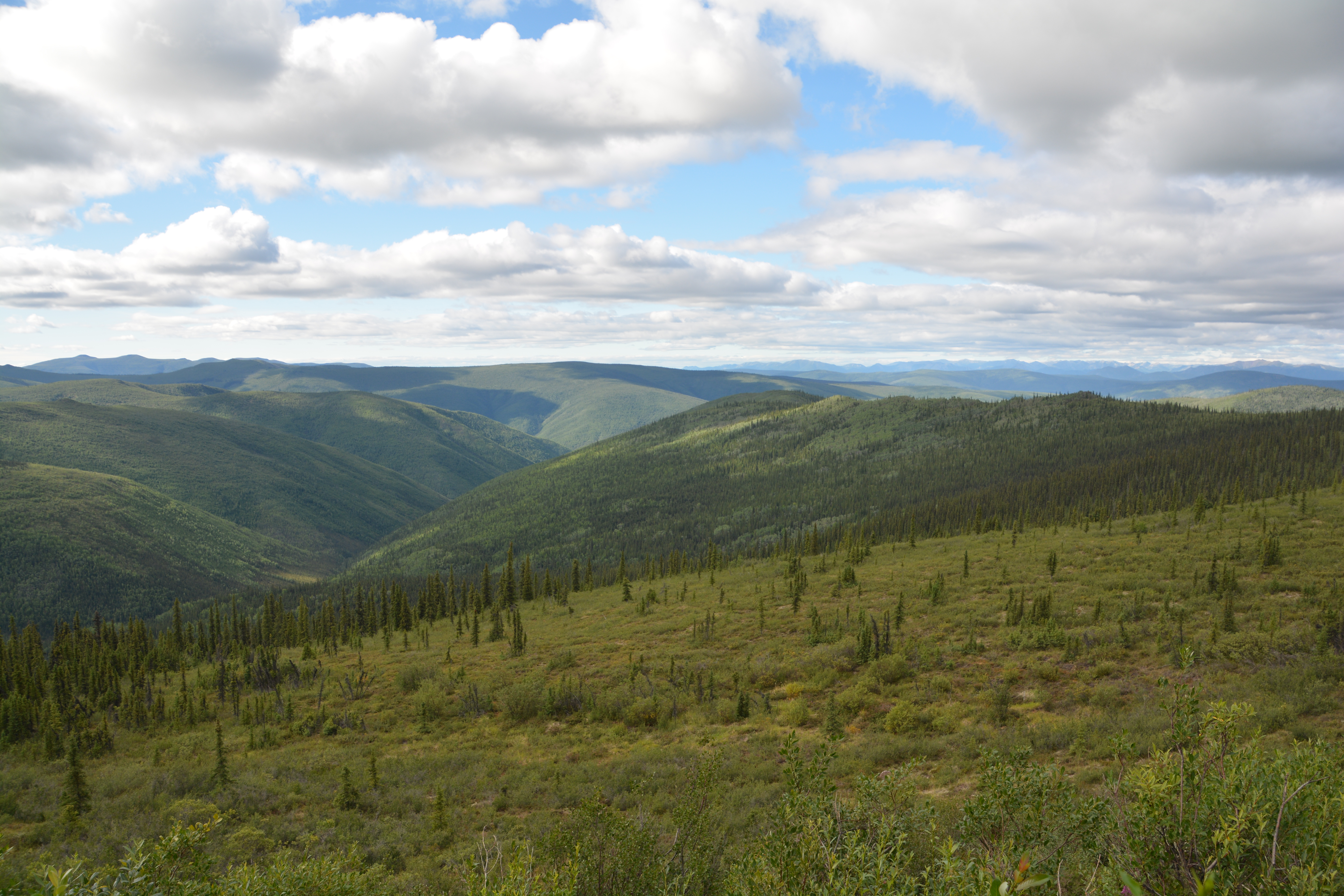 The drive south on the Dempster Highway was similar to the drive north – drizzly, low clouds and fog, slippery road, glimpses of astounding beauty and a forever feeling that we were travelling through a very special place. Late in the afternoon we stopped again at Tombstone Territorial Park, did a short walk to the fog line for expansive views of this stunning setting, saw five beavers in a single pond busy building dams and their lodges, and finally camped in another scenic off-road area near the North Klondike River.